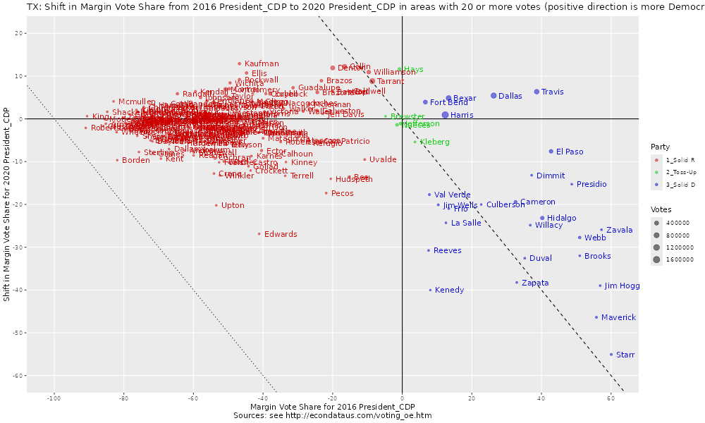 As can be seen, the red Republican-leaning counties and the green toss-up counties appear to have, on average, remained about the same from 2016 to 2020. That is, they did not not swing obviously Democratic (up) or Republican (down) on average. The blue Democratic-leaning counties also shifted both up and down but the greater majority, especially those in south Texas and/or along the southern border shifted down. Much of this may have been offset by the fact that may of the largest blue counties like Harris, Bexar, Dallas, and Travis shifted up.