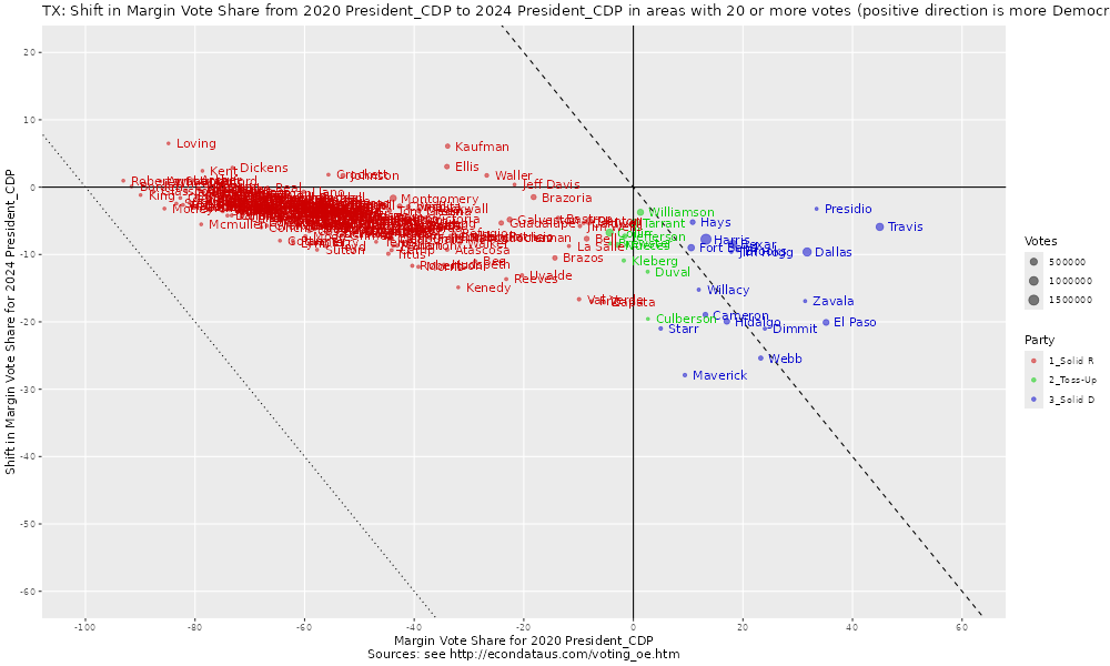 However, the prior plot before that showed that the great majority of Texas' counties shifted Republican (down) in 2024 with the amount of the shift down increasing as the counties became more Democratic. The reasons for this shift is unclear but it does look like the pattern that would result if all Republican voters from 2020 continued to vote Repulican but a set percentage of Democratic voters from 2020 switched. It would seem worth calculating a regression line for the shift and seeing how closely this would fit such a formula.