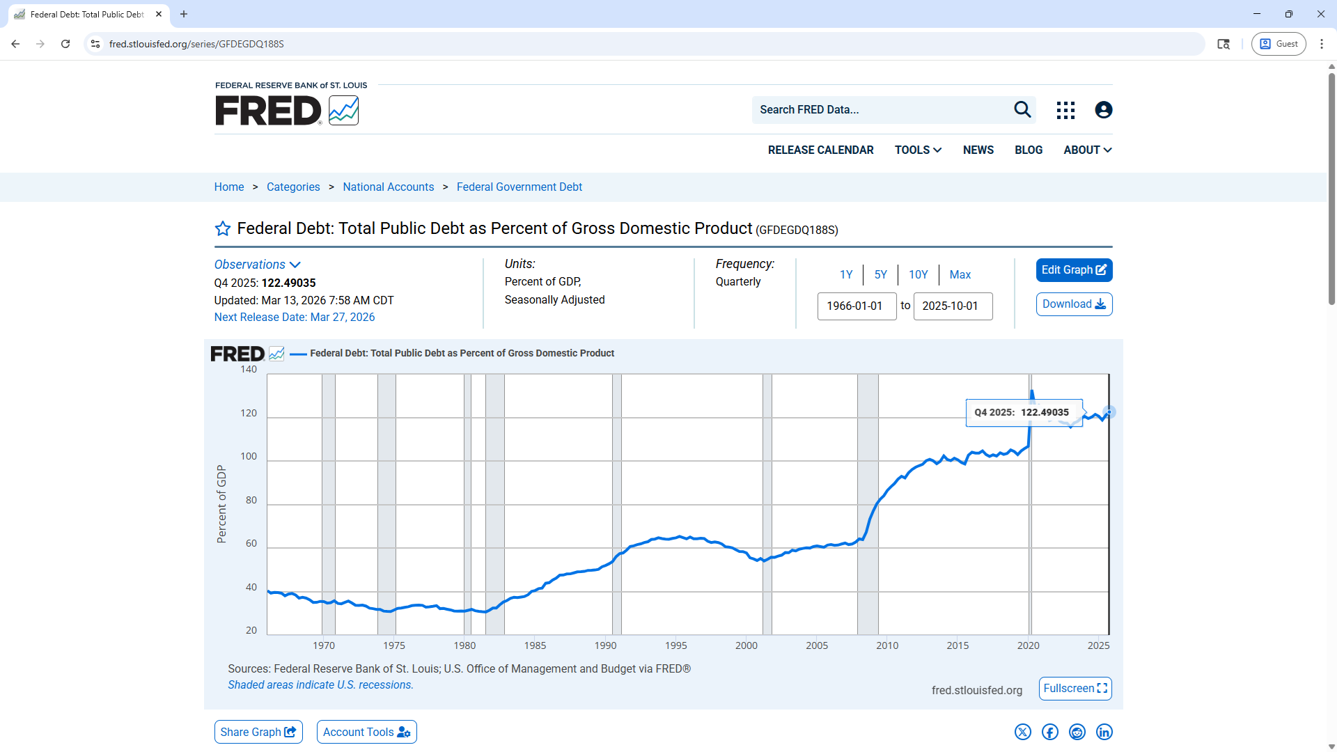 This shows that the "$33 trillion in federal debt" referred to in the prior article refers to the "Gross Debt" which included the "Public Debt" (or debt held by the public) plus intergovernmental debt held by the U.S. government. The usual way to judge the burden that this debt puts on the economy is to look at it as a percent of GDP. Changing Units to "Percent of GDP" creates the following graph: